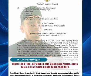 Malili, potretlutim.com — Pemerintah Kabupaten Luwu Timur resmi memberlakukan pembatasan jam malam bagi pelajar di wilayahnya. Kebijakan ini...