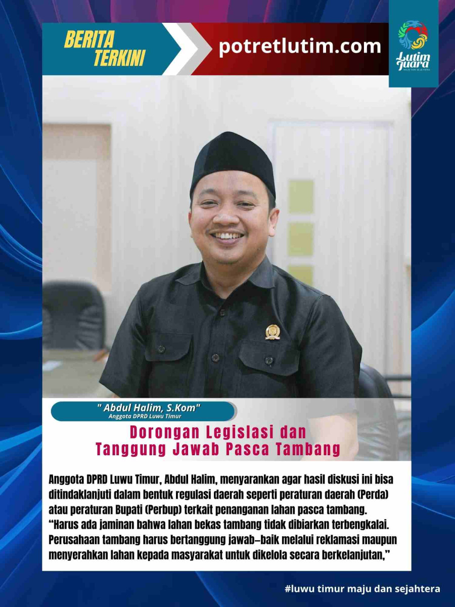 Dalam kesempatan yang sama, Anggota DPRD Luwu Timur, Abdul Halim, menyarankan agar hasil diskusi ini bisa ditindaklanjuti dalam bentuk regulasi daerah seperti peraturan daerah (Perda) atau peraturan Bupati (Perbup) terkait penanganan lahan pasca tambang.