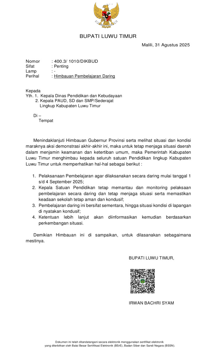 - Luwu Timur, potretlutim.com – Bupati Luwu Timur, Irwan Bachri Syam, mengeluarkan himbauan resmi agar seluruh satuan pendidikan di wilayahnya melaksanakan pembelajaran daring mulai tanggal 1 hingga 4 September 2025.