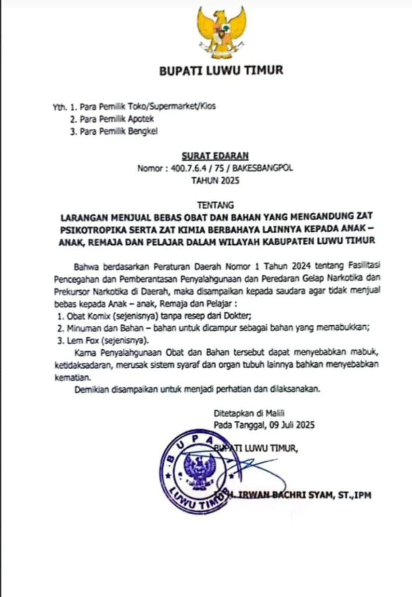 Malili, potretlutim.com— Pemerintah Kabupaten Luwu Timur melalui Bupati Irwan Bachri Syam secara resmi mengeluarkan Surat Edaran Nomor: 400.7.6.4 / 75 | BAKESBANGPOL TAHUN 2025, yang berisi larangan menjual bebas obat dan bahan yang mengandung zat psikotropika serta zat kimia berbahaya kepada anak-anak, remaja, dan pelajar di wilayah Kabupaten Luwu Timur.