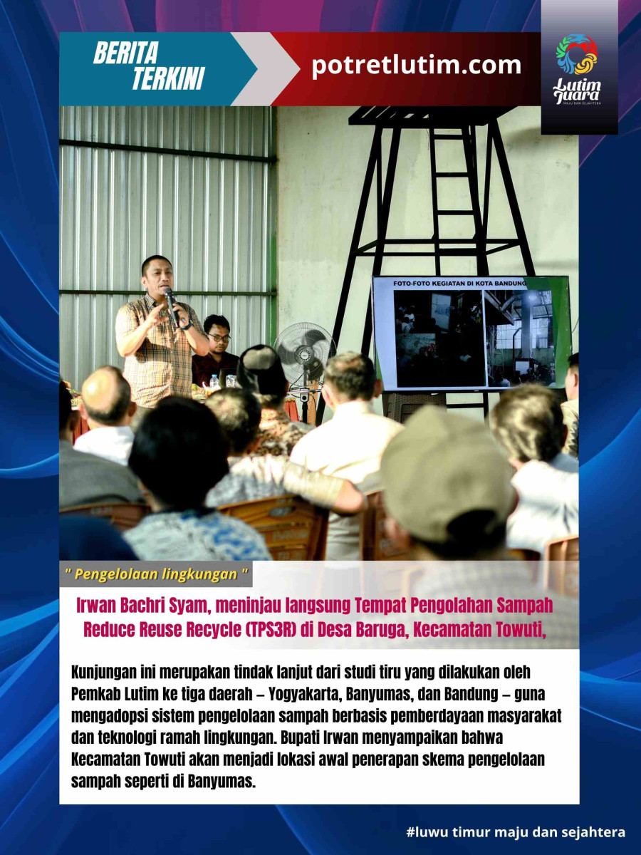 Towuti, potretlutim.com — Bupati Luwu Timur, Irwan Bachri Syam, meninjau langsung Tempat Pengolahan Sampah Reduce Reuse Recycle (TPS3R) di Desa Baruga, Kecamatan Towuti, Minggu (20/7/2025).
