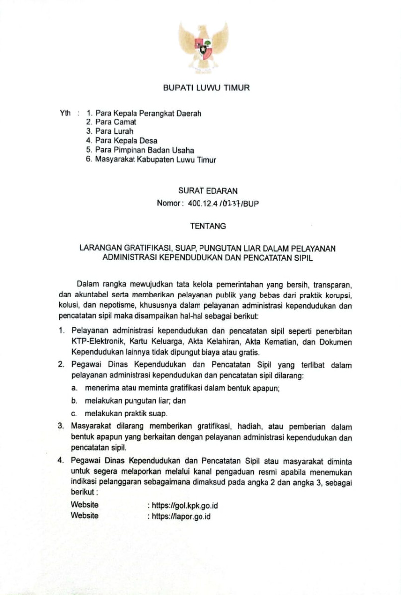 Hal ini sesuai dengan Surat Edaran Bupati Luwu Timur tanggal 20 Agustus 2025 Nomor: 400.12.4/0237/BUP tentang Larangan Gratifikasi, Suap, dan Pungutan Liar (Pungli) dalam Pelayanan Administrasi Kependudukan dan Pencatatan Sipil.