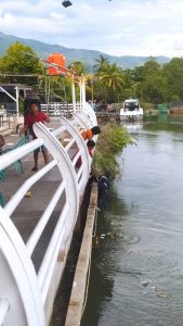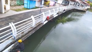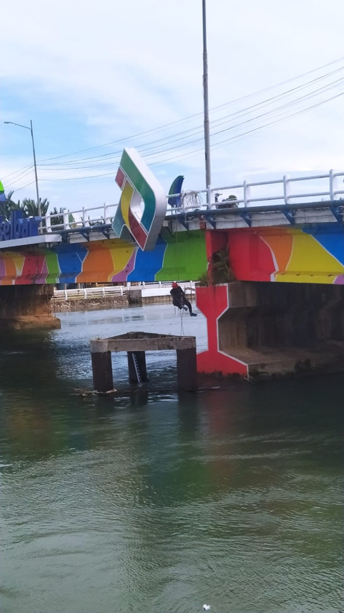 Para relawan tampak bekerja keras membersihkan lumut dan kotoran di dinding anjungan dengan alat-alat sederhana sambil bergantung menggunakan tali pengaman di atas sungai.