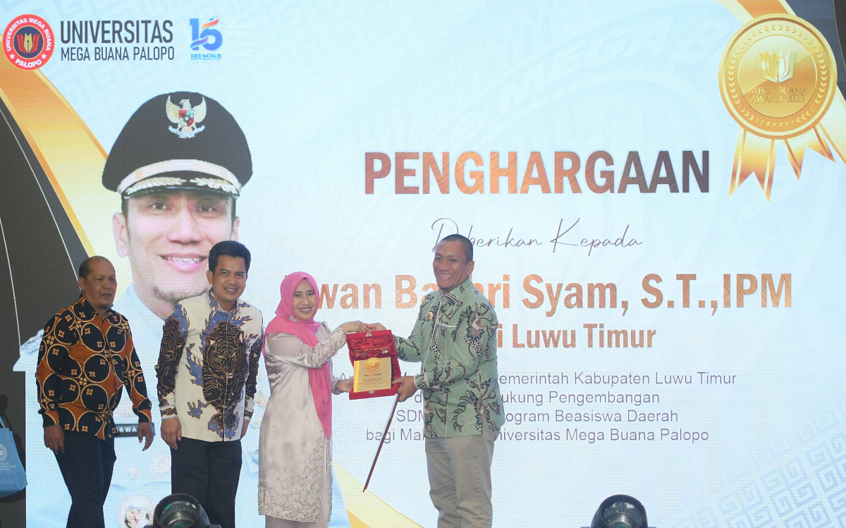 PALOPO, potretlutim.com — Bupati Luwu Timur, Ir. H. Irwan Bachri Syam, ST, IPM, kembali mencatatkan prestasi gemilang dengan menerima penghargaan bergengsi Mega Buana Award 2025. Penghargaan ini diberikan oleh Universitas Mega Buana Palopo sebagai bentuk apresiasi atas dedikasi dan komitmen Pemerintah Kabupaten Luwu Timur dalam mengembangkan Sumber Daya Manusia (SDM) lewat program Beasiswa Daerah yang inovatif.