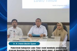 potretlutim.com – Menyambut Hari Ulang Tahun (HUT) ke-22 Kabupaten Luwu Timur pada 19 Mei 2025 mendatang, Bupati Irwan Bachri Syam mengumumkan akan meluncurkan program unggulan berupa tiga kartu layanan publik, salah satunya Kartu Pintar yang ditujukan untuk mendukung pendidikan anak-anak di Luwu Timur.